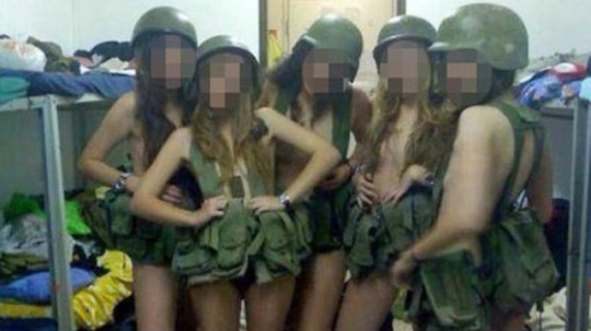 Israeli news site Walla said the women were new recruits stationed on a base in southern Israel. One picture showed the soldiers removing their fatigue uniforms to expose their underwear and back sides. In another, five women posed in what appeared to be a barracks room, dressed only in helmets and a small amount of combat equipment. The faces of the soldiers were blurred in the photos.